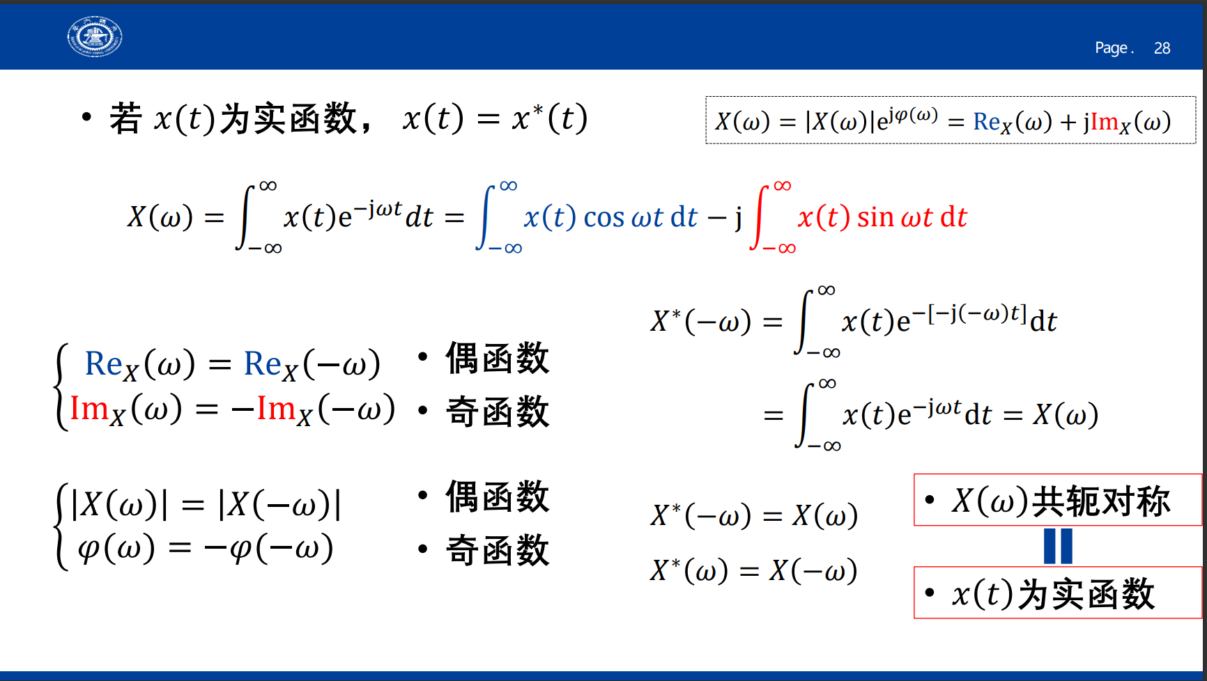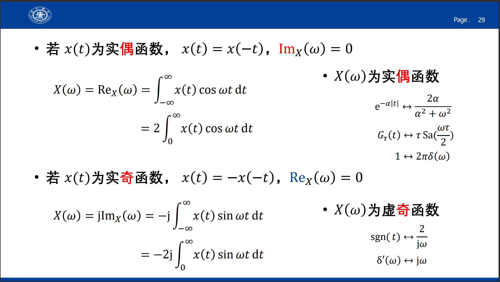 傅里叶变换具有奇偶虚实性。任一傅里叶变换对\(x(t)\leftrightarrow X(\omega)\),则\(x(-t)\leftrightarrow X(-\omega)\),且\(x^*(t)\leftrightarrow X^*(-\omega)\).